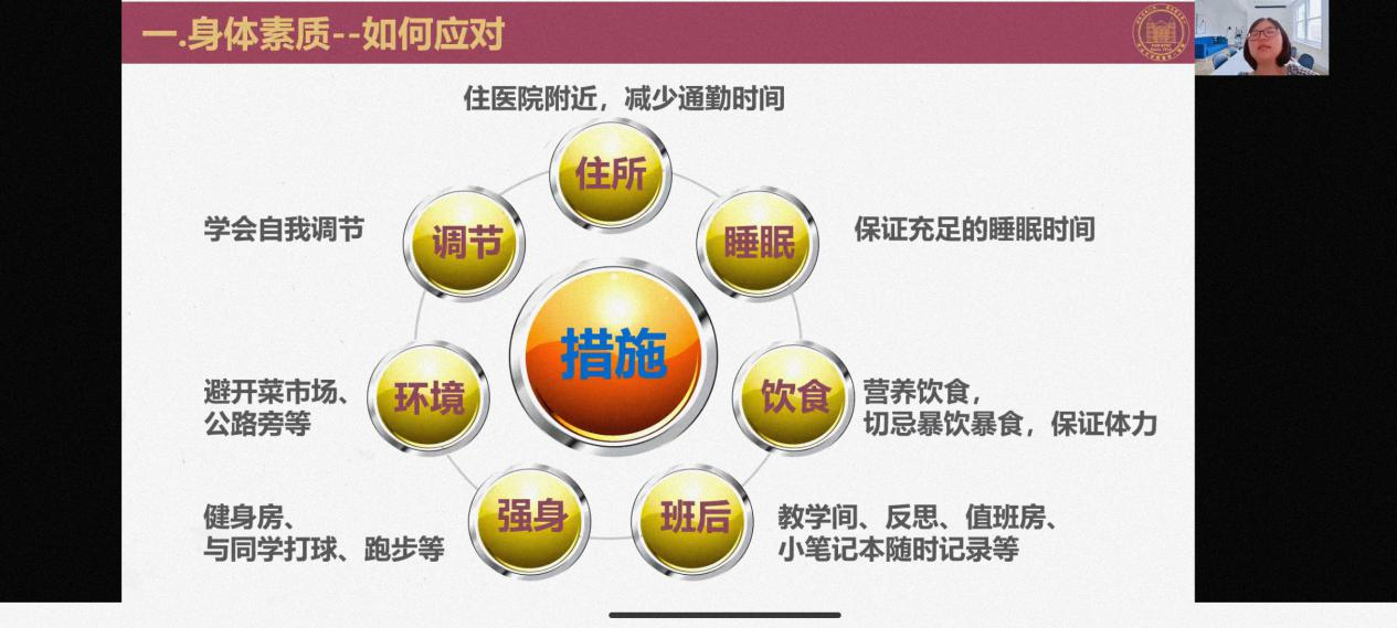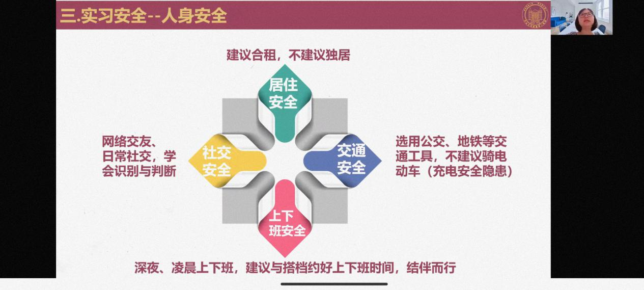 紧接着,师姐还从人身安全、财产安全、职业安全三个方面对实习安全提出相关建议。提醒我们要上下班尽量结伴而行,遇到问题及时寻求帮助,同时要牢记实习身份,不独自操作和遵守医院规章制度等。