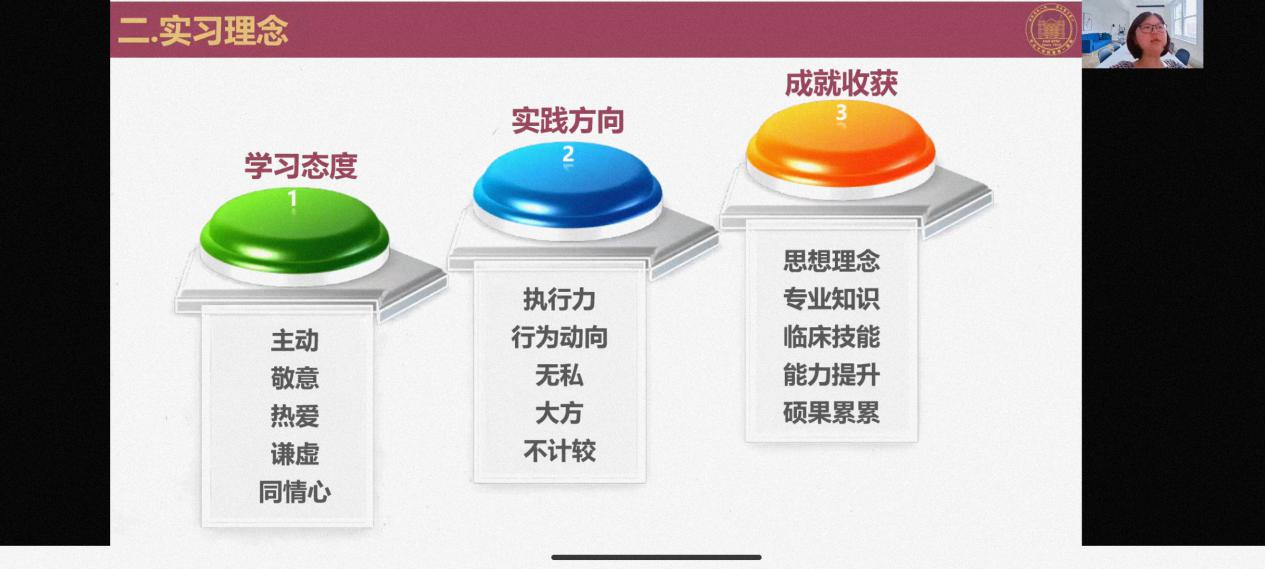 接着,王萍师姐为我们讲解了实习理念。提出在实习时,在学习态度上我们应该主动、敬意、热爱、谦虚和保持同情心;在实践方向上,我们要做到执行力强,无私、大方和不计较。在九个月实习下来之后,你可能就会发现,积极的学习态度思想会让你的专业知识、临床技能等方面都能够得到一个提升。