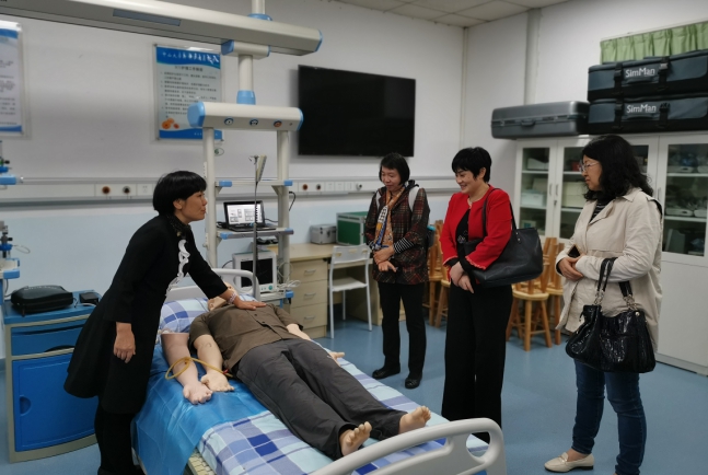 图为专家们在王秀岚院长的陪同下参观我院护理实验实训中心