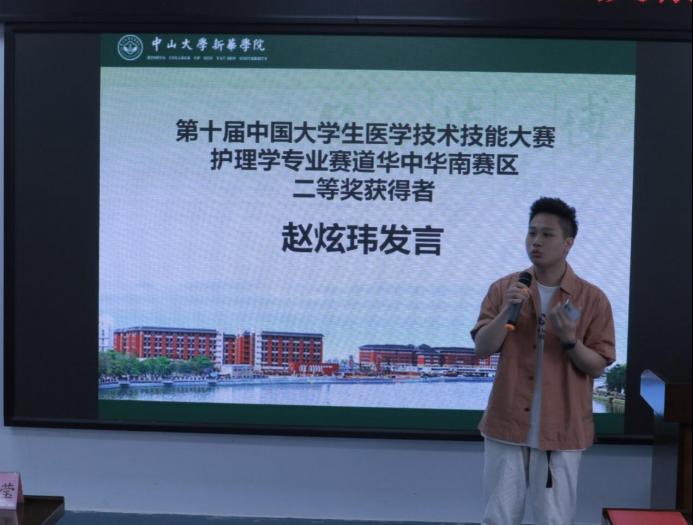 紧接是校友赵炫玮师兄发言。赵炫玮师兄强调,技能是我们身为护士的基础,我们要把技能变成肌肉记忆和本能反应,这也是护士工作最基本的保障。同时,师兄强调了临床思维转变的重要性:护士应该有自己的思维,我们不仅是执行者,更是审核者,要将“被动”变“主动”,才能为救治病人的流程锦上添花。