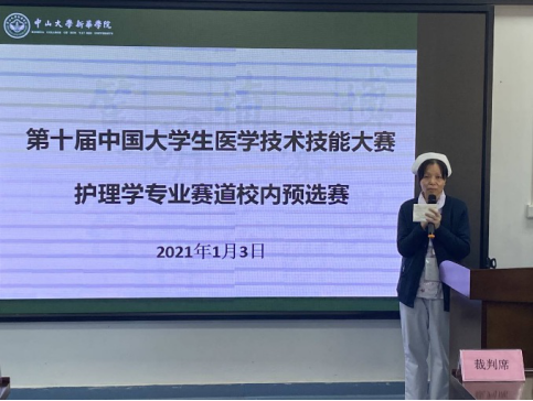 为全面提升学生综合素质和技能水平,选拔优秀的参赛选手参与“第十届中国大学生医学技术技能大赛”,中山大学新华学院护理学院(以下简称“护理学院”)于2021年1月3日上午9点在护理实验实训中心举办“第十届中国大学生医学技术技能大赛——护理学专业赛道校内预选赛”。