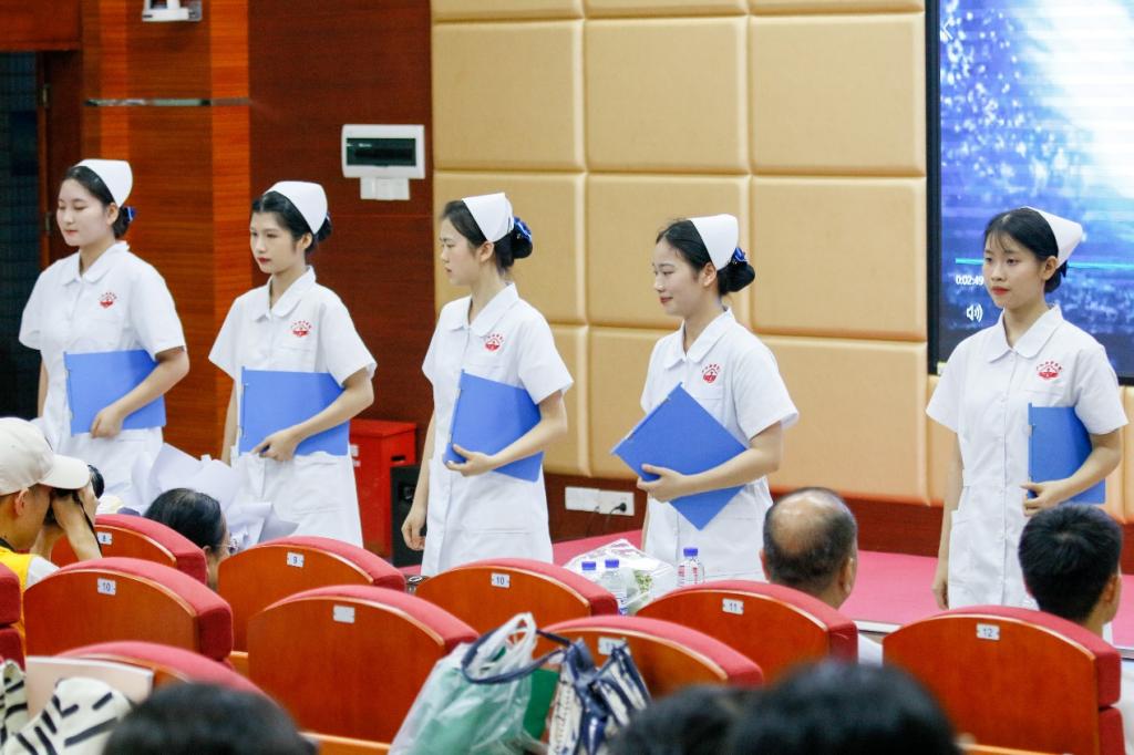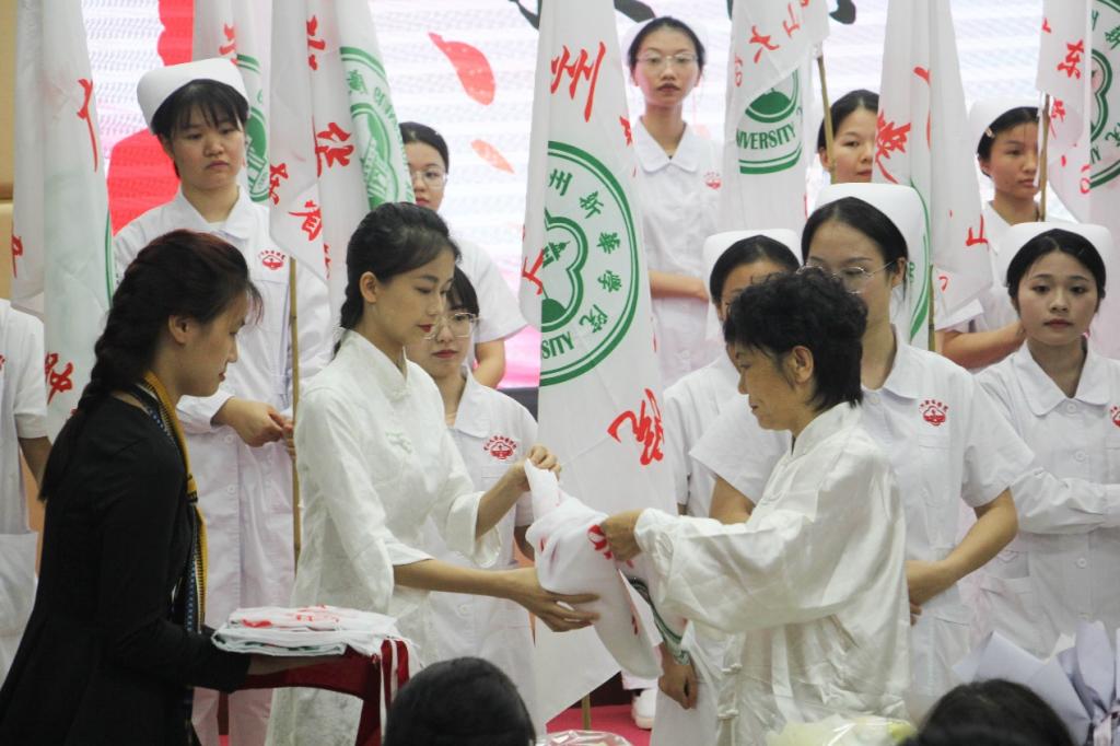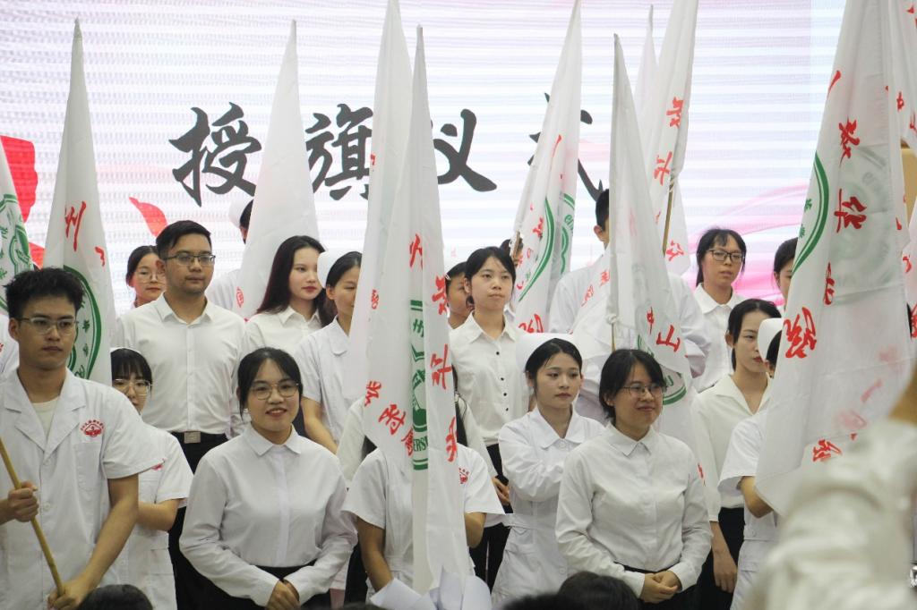 接下来到了授旗仪式与实习生宣誓环节。在这个峥嵘的岁月里,逆风奔跑的人,即使面对困难和逆境,也不会被打倒;即使面对狂风暴雨,也总有人在前路为我们遮风挡雨白衣天使们就是这样的人。接下来,这份责任,将要延续给我们新一届的护理实习者。白衣炫五月,天使佑中华。