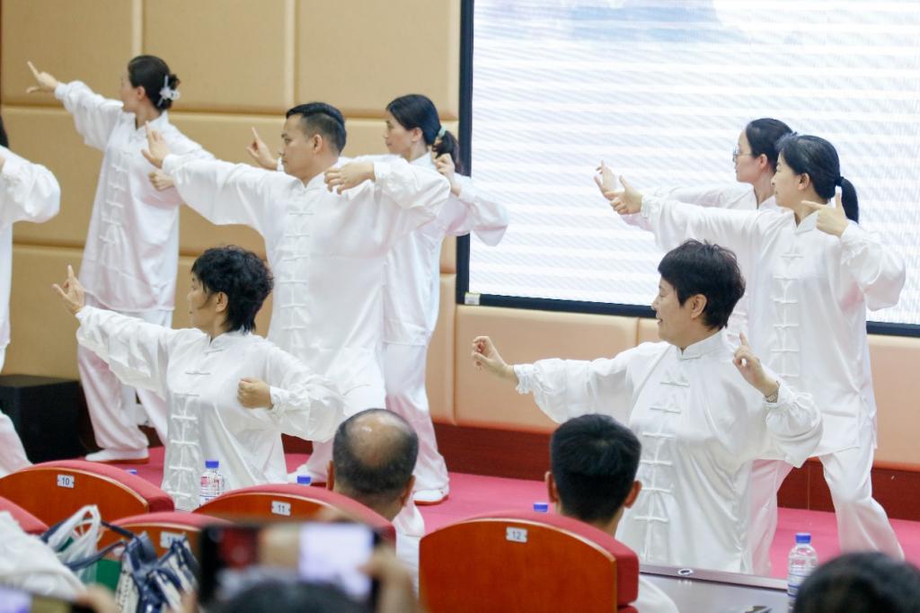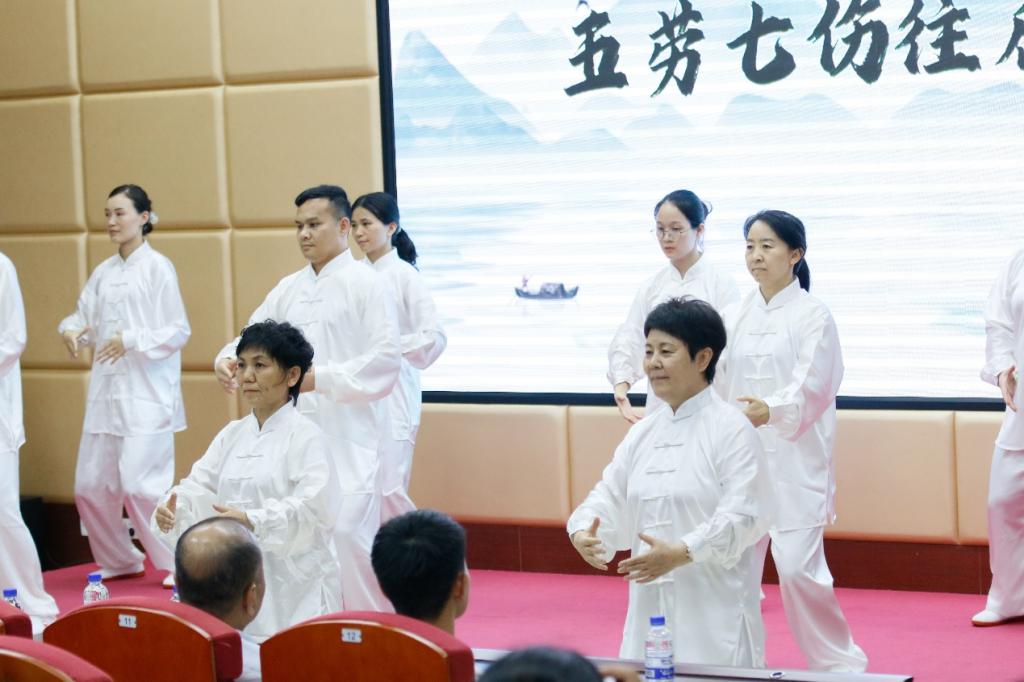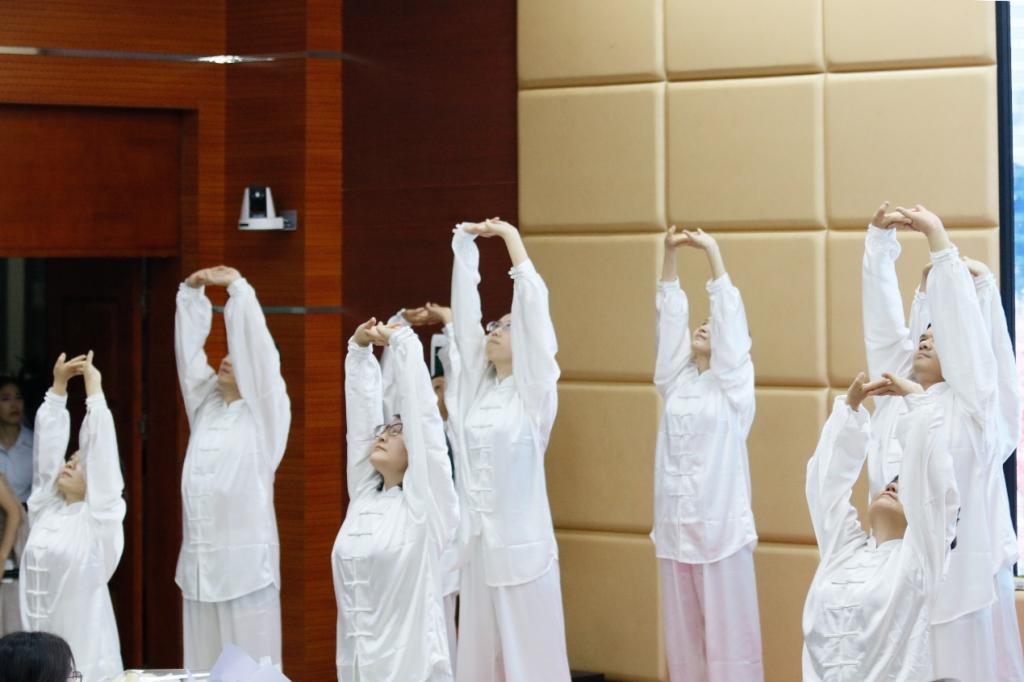 在晚会现场,护理学院的老师们为大家带来了表演《八段锦》“抓地托天理三焦,左右开弓似射雕”,这便是八段锦,它由八种如“锦锻般优美,柔顺的动作组成,更是国术精华之集“锦”。