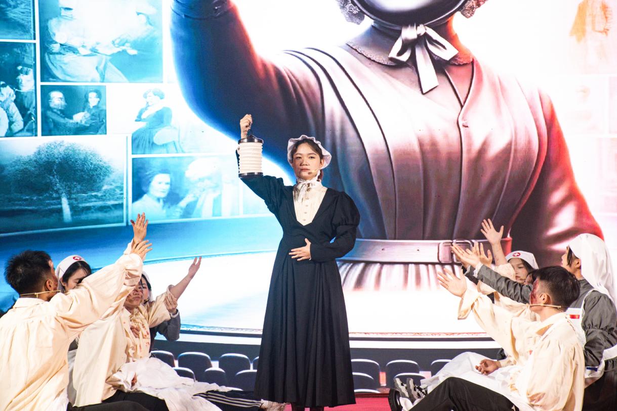 在护理学院的同学们主演的《光明的使者》英语舞台剧中,观众们跟随剧情的脉络,领略医者们的坚守与奉献,感受医者仁心,感受生命的真情,共同赞美天使白衣下的人性光辉。