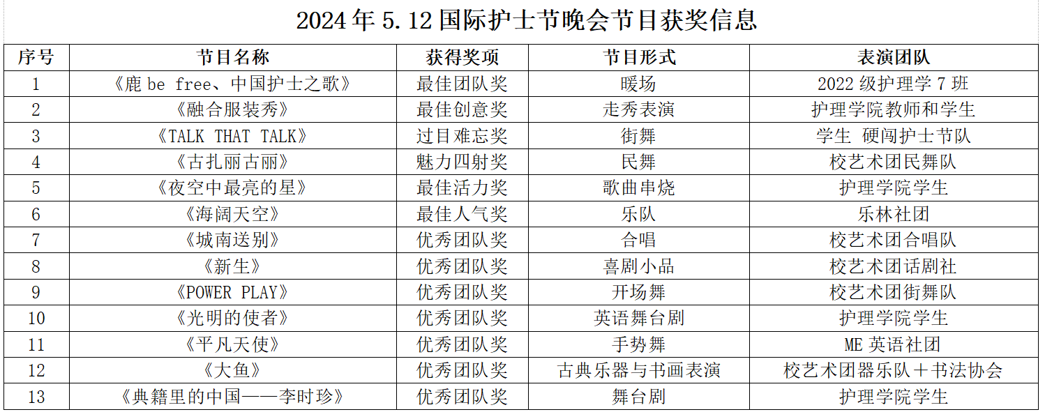 晚会中场,我们举行了隆重的颁奖仪式,由与会的学校领导嘉宾分别为护理学院的师生们颁奖。鼓励同学们继续倡导、继承和弘扬南丁格尔不畏艰险、甘于奉献、勇于救死扶伤的人道主义精神与美好品质。希望师生们不忘初心,为增进人民健康福祉继续做贡献。