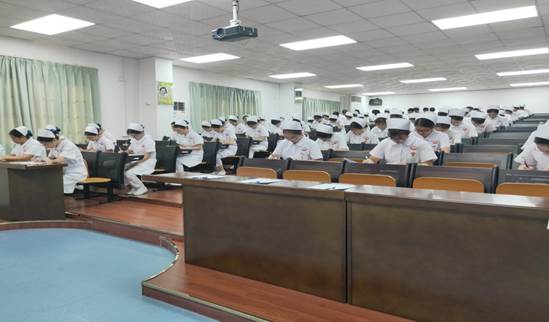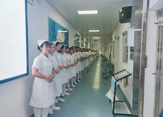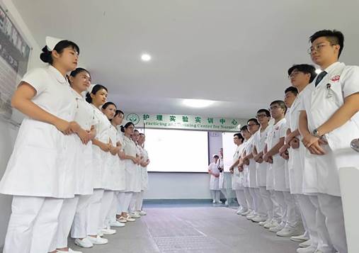 同学们仪表端庄,站姿挺拔地在护理实验实训中心门口排列整齐,准备迎接陈利芬副主任等老师们的到来。