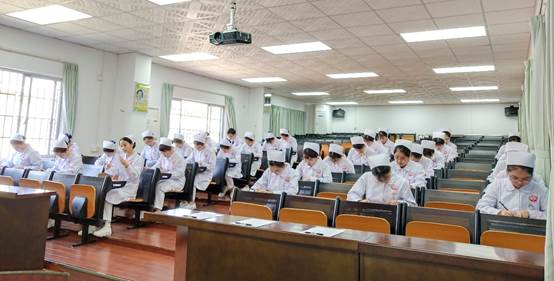 实操考试以6人为一组同时进行操作,本次技能操作内容为皮下注射,操作时间为6分钟。在操作考试前同学们有序地进行备物,考试计时开始,同学们虽然有些紧张,但仍能较熟练地进行操作,体现出了同学们较好与患者进行沟通交流的能力、严格的无菌操作观念,整体表现不错。