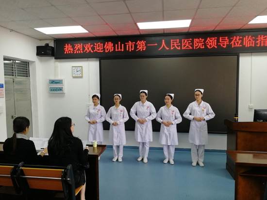 同学们整理好着装,做好准备迎接医院的老师们。在大家紧张的等待中,我院办公室主任黄洛莹带领着陈书人主任、黄芸老师一行二人出现在大家的视线里,大家齐齐问候,热情欢迎二位老师的到来。
