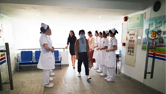 上午九点十五分整,周丽平护士长和陈丽珊老师在护理学院林丽娜老师的陪同下到达护理实验实训中心,同学们齐齐高声问候,老师们也热情地回应同学们。