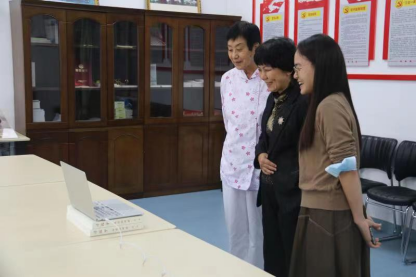 王秀岚院长、于凤兰书记、何洁凝老师正在和赖开兰主任、杨小月主任和赵黎老师交流