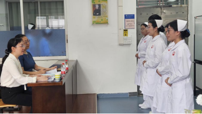 参加面试的同学在护理实验实训中心门口队列欢迎周主任和梁副主任的到来,王院长与医院两位老师就此次参加面试的实习生基本情况进行了深入的交流。两位老师纷纷表示,前来等候面试的同学朝气蓬勃,举止得体,展现出了积极进取的精神风貌。医院老师们对接下来的面试充满期待,希望能看到同学们出色的表现。