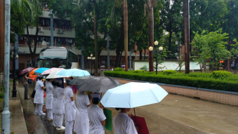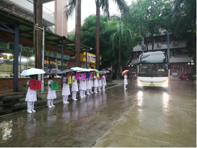 2019年6月24日早上七点半,2017级的师弟师妹们已经站在生活园的校道上,等待着收拾好行李的师兄师姐。2017级有的同学去帮忙搬行李,宋建玲老师也过来帮忙,鼓励他们不要紧张。雨,淅淅沥沥地下着,但挡不住2017级学子欢送的心,也挡不住2016级学子寻梦的心。8:30去中山大学附属第八医院实习的大巴缓缓驶出校园,站在校道上的学子高举着:“祝师兄师姐实习顺利!”