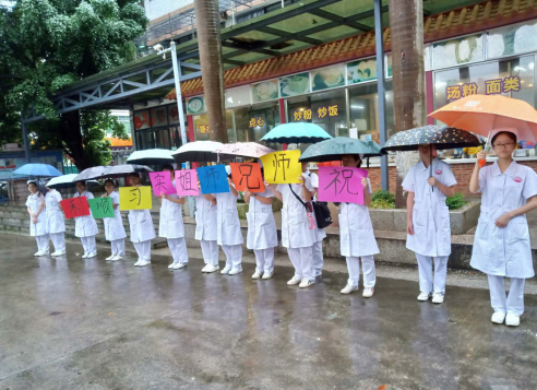 一霎时,雨点连成了线,""的一声,大雨就像天塌了似的铺天盖地从天空中倾泻下来。2019624号中山大学附属第八医院(以下简称“中大附八”)实习小组11名同学准备从学校出发前往中大附八报道实习。清早,指导老师宋建玲教授来送我们,再次叮嘱我们实习过程注意安全,要谦虚请教老师,临告别时祝福我们实习顺利。师弟师妹们冒雨在生活园门口为我们举牌欢送,车辆缓缓开出,我们启程。