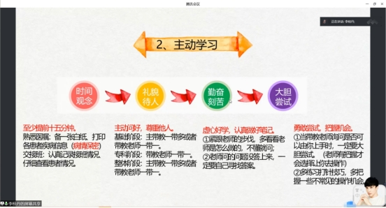 接下来是李桂丹师姐进行实习经验分享,桂丹师姐分别介绍了其所在的实习医院——中山大学孙逸仙纪念医院的一些基本规章制度和带教老师的相关情况,内容详尽,包含假期安排、早晚班、科室出科(理论+操作)、操作机会、请假、迟到等方面。并且向同学们提到,当大家去到实习医院后要主动熟悉医院的环境,明确实习任务,熟悉班次的职责,可以准备一个小本子作为量化本,每天做好反思日志。在实习的过程中,最主要是要学会观察、学会积极主动、学会感谢。学会观察就是观察带教老师的操作流程与带教风格、观察病人的病情变化;学会积极主动就是主动学习、积极敢于提问、主动争取学习和展示的机会,大胆尝试,抓住每一次带教老师给予的操作机会,在老师操作示范时可适当做好笔记,当天及时整理及时复习;学会感谢就是要感谢带教老师的倾囊相授、感谢病人的配合给予实习生学习的机会等。桂丹师姐还提到,调整心态是非常重要的,希望同学们实习前一定要做好实习的心理建设,当遇到不被患者信任,质疑自己能力的时候,我们要增强自己的信心,让患者相信自己的技术,当一次操作做不好时,不要怀疑自己,要去进一步找到自己失败的原因,多去请教老师,不懂就问,主动求学,争取下一次做得更好!最后桂丹师姐对即将进入实习的同学们提出五点要求:强调无菌观念、注意人文关怀、解释操作目的、学会健康宣教以及严格遵循三查八对。希望同学们能够践行于心,护理于行!