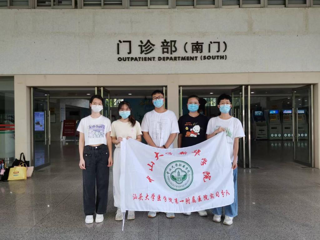 图为5位实习生在汕头大学医学院第一附属医院门诊部合影