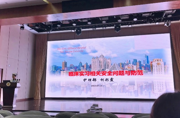 7月13日下午,由各校学生代表介绍学校情况。我校由中大附一的实习组长陈添珍作为学生代表,向同学们和老师们介绍了我校的基本的发展历程、校园文化、护理学院资讯、中大附一实习团队以及实习展望。最后,柯彩霞老师再次强调了实习期间的注意事项,并安排了各科总带教老师领第一批进入本科室的实习生熟悉相关病区位置。