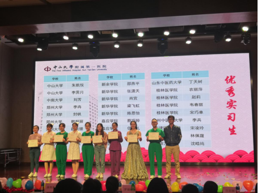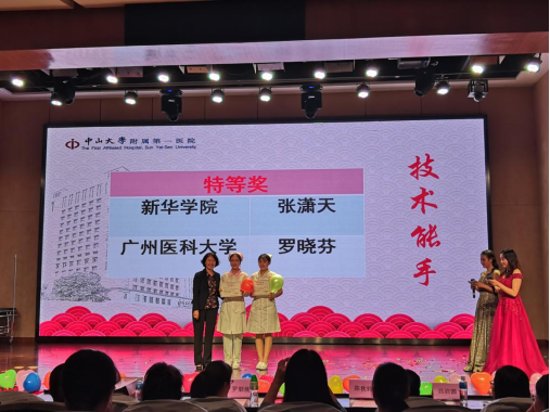 大会最后,表彰了优秀的实习同学,我院的张潇天同学获得了技术能手特等奖,李艳芬同学获得三等奖。同时,张潇天、肖宜、梁飞虹、陈思怡四位同学分别获得了中山大学附属第一医院“优秀实习生”的荣誉称号。