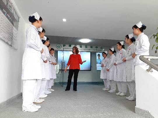 在同学们翘首以待的期盼中,中山八院护理部方向红副主任、赵洁护士长一行二人在我院党总支书记于凤兰、首席教授Susan、办公室主任黄洛莹等老师们的迎接下,到达了我院护理实验实训中心。