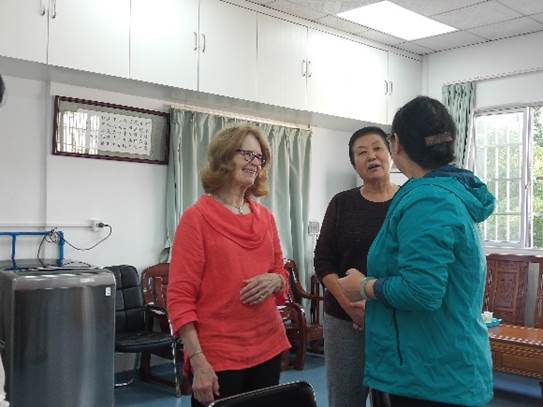 图三:Susan教授(左)、于凤兰书记(中)、方向红副主任(右)交流中
