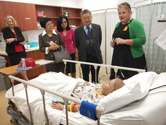 上午9:00至10:00,在Dean Karshmer, Dr. Thatcher 和Dr. Kenny的引领下,护理模拟实训中心主任Margaret Calacci带领我校代表团参观了其实验室,包括内外科、妇产科、儿科、远程医疗等,介绍了ASU护理实验课情况,也展示了其模拟实训的教学系统。我校代表团认真观看,学习其优点,以更好地促进我校护理学的发展。