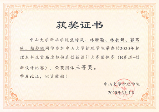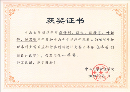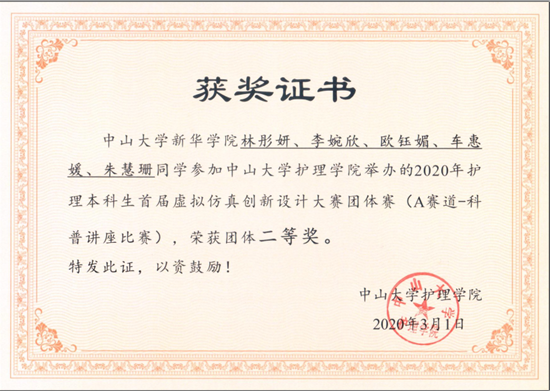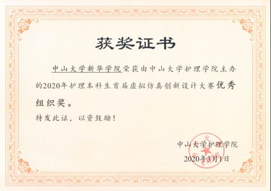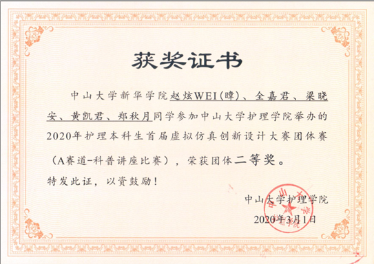 2020年2月29日及2020年3月1日,中山大学举办首届护理本科生“虚拟仿真”创新设计大赛,因疫情影响,原定的线下比赛改为线上举行。中山大学新华学院护理学院积极组织了2017级和2018级的学子们报名参赛。赛制设置了初赛及团体决赛二个模块,初赛为上机竞赛方式,进入初赛者,可以自由组队参加团体决赛,团体决赛分为A、B二个赛道,按年级分组,任选一个赛道。先由学院内评审决出2017级、2018级的A、B赛道各一组共4个团队参加6所学院的总决赛。初赛及团体赛奖项皆设置有一等奖、二等奖、三等奖和优秀奖四个级别。