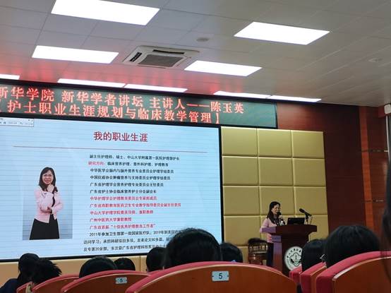 2020年10月26日上午,中山大学护理学院于教学楼D101举行以“护士职业生涯规划与临床实习教学管理”为主题的学者讲坛。此次活动邀请了中山大学附属第一医院(以下简称“中山一院”)护理部区护长、副主任护师陈玉英作为此次学者讲坛的主讲嘉宾,护理学院副院长黄洛莹担任主持人,护理学院执行院长王秀岚携办公室主任周玲、辅导员梁家翠等老师,及2018级护理学专业全体同学到场。