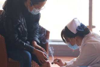 活动开始,志愿者们提前到达活动现场进行布置,做好艾灸前工作准备。随着老师们的到来,志愿们逐渐开展工作,进行艾灸服务的同时,志愿者们向老师们详细介绍了艾灸的适合人群,使用方法、穴位和功效。艾灸是用艾叶制成的艾条,产生的艾热刺激人体穴位或特定部位,通过激发经气的活动来调整人体紊乱的生理生化功能,从而达到防病治病目的的一种治疗方法。