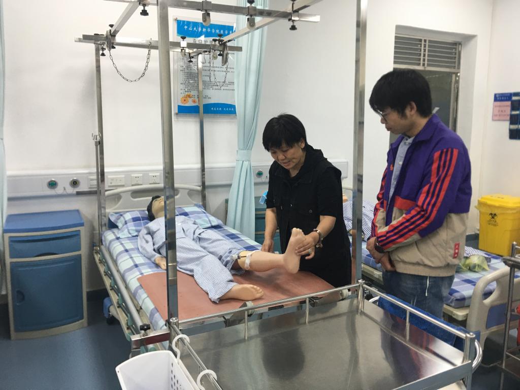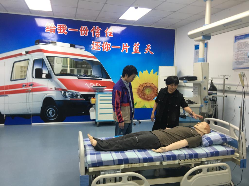 图为王秀岚院长向李雄宾工程师详细介绍我院护理实训中心的相关设备