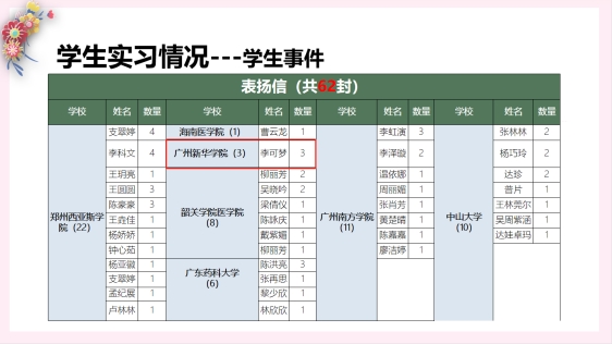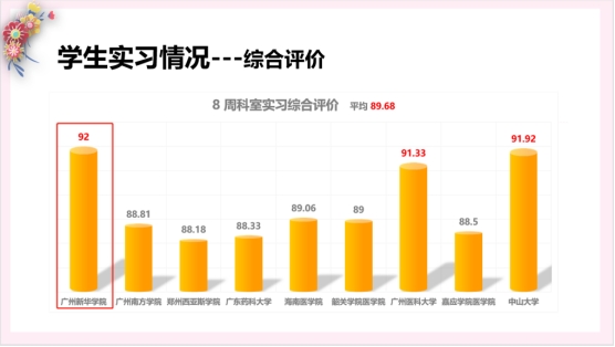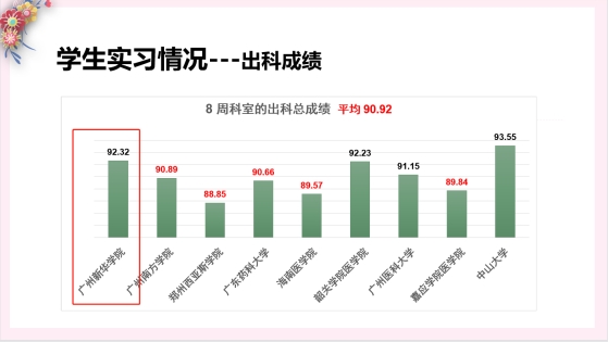 黄艺芳老师提到,在8周科室出科总成绩及出科评价中,122cc太阳集成游戏(以下简称“我院”)在其他8所院校中稳居第一和第二名。另外,在学生事件中,我院李可梦同学收到来自病人及家属表扬信3封,得到带教老师的一致肯定。