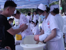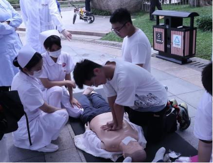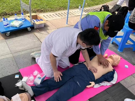 志愿者指导居民学习心肺复苏术
