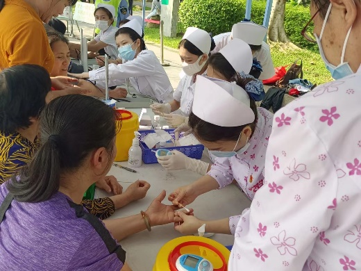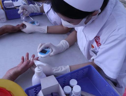志愿者为居民测量血糖