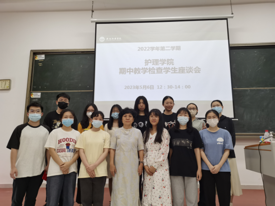 为持续加强教学过程临控与管理,结合学校开展以“坚持持续改进,打造质量文化”为主题的2022学年第二学期期中教学检查工作,护理学院于2023年5月6日12:30至14:00在D301召开了学生座谈会,会议由教学秘书巫碧梅主持,执行院长王秀岚、各年级辅导员以及2022级、2021级、2020级等36名学生代表按年级依次出席。
