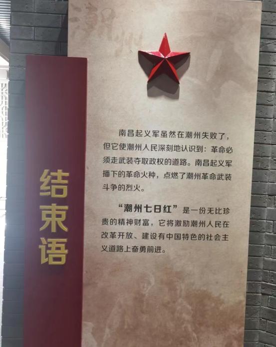 步入“涵碧楼”内参观“潮州七日红”革命史展览。展览以“潮州七日红青史垂千秋”为主题,按时间排序精心设计“潮州工农运动的兴起”、“南昌起义军挥师南下,进军东江”、“策应起义军进占潮州”、“潮州七日红”4个部分,通过历史图片、AR动画、VR体验、雕像群等生动再现“潮州七日红”波澜壮阔的历史画卷。在讲解员的带领下,大家认真重温了“潮州七日红”那段波澜壮阔的峥嵘岁月,感受中国共产党人前仆后继、不懈奋斗的伟大革命精神。