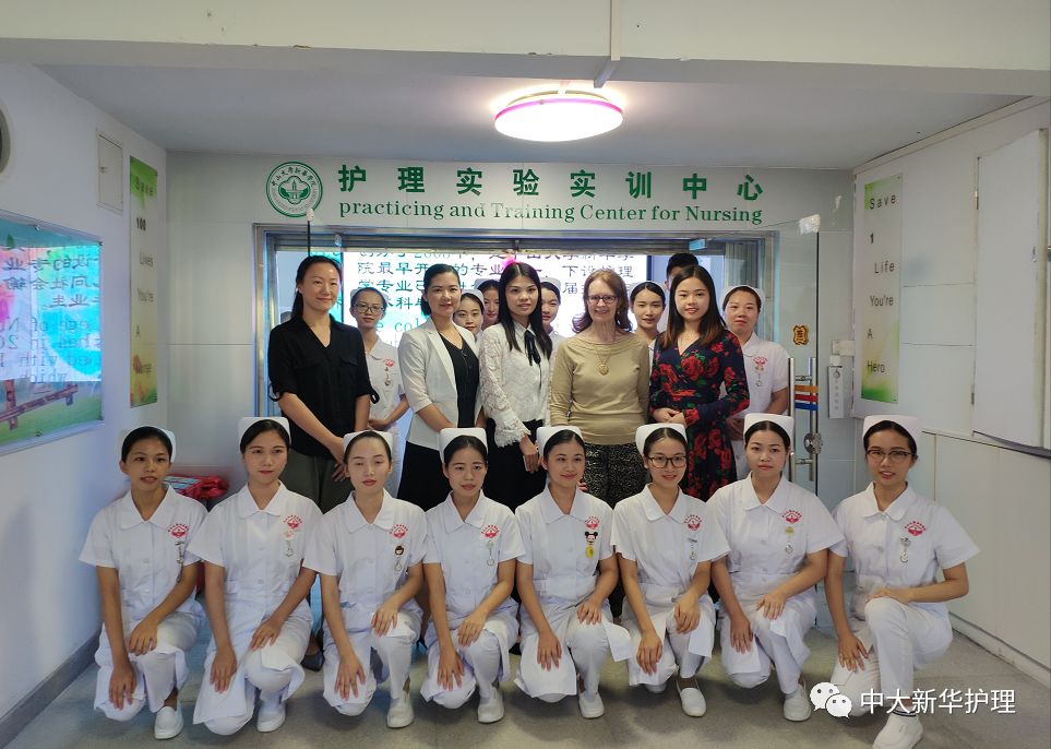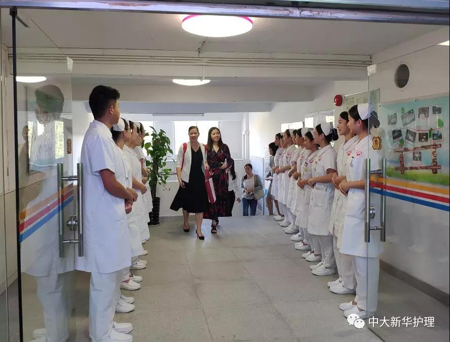 参加这次实习招聘面试的同学在护理实验实训中心门口排成两列,精神饱满,热情地迎接前来实习招聘面试的医院的老师们。他们饱满的精神状态给医院的邓云平护长,徐可老师,蔡喜远老师留下了深刻的印象,医院的老师主动提出要与参加面试的同学们合照。合影结束,医院的三位老师在护理学院党总支副书记于凤兰老师、陈千副院长、Susan教授、办公室主任黄洛莹老师、黄廷芬老师、陈壮艳老师、邓玥琼老师、钟春燕老师、梁家翠老师、佘蓉老师、周玲老师、吕占宇老师等的陪同下来到护理实验室办公室座谈。