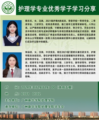 为进一步发挥优秀同学的榜样引领作用,更好地明确学习方向,不断提高自身的学习能力,加强学风引领,护理学院于2024年3月28日19:00在教学D301、D302举办护理学专业优秀学子学习分享讲座,特邀2021级两位优秀学子——钟泳欣、陈乐乐为2022级护理学全体同学带来经验分享。本次会议采取线上线下相结合的方式举行,由2022级辅导员钟婉老师主持。本次活动由护理学院学生会承办。