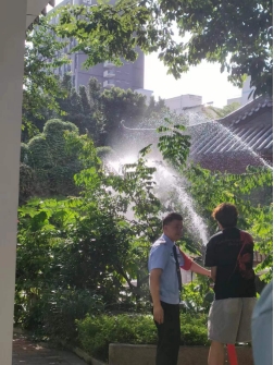 下午15:30,总务处的老师为实习小分队介绍了医院的消防设施、灭火器存放地点等,随后带领实习生在医院后花园进行了消防演练,指导大家熟悉灭火器和高压水枪的使用方法。