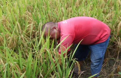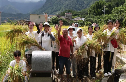 图四 黄柱根为山水菌缘社会实践队成员们示范如何割稻