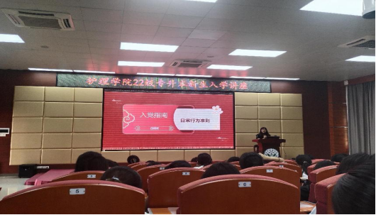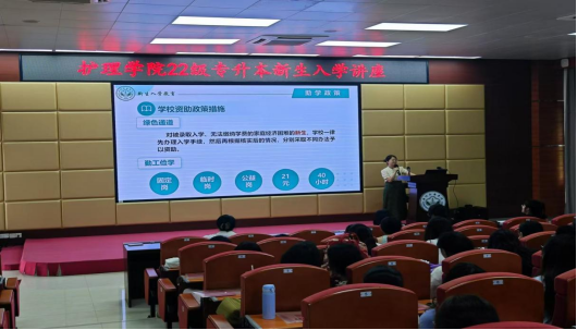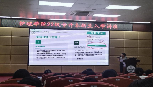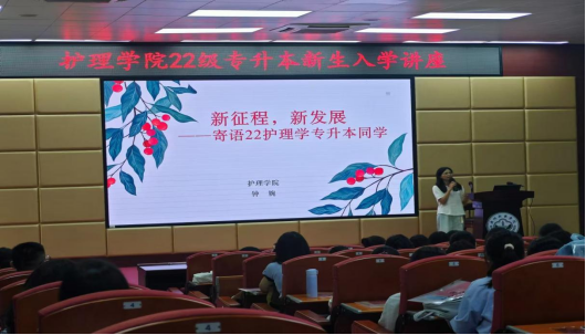 本次讲座由2022级护理学(专升本)新生辅导员刘静老师主持,特别邀请各班班主任林丽娜老师、赵小慧老师、宋秀秀老师与新生举行见面仪式,邀请罗冰老师、黄海萍老师、曲楠楠老师、朱晓洁老师、曾美霞老师、钟婉老师为22级专升本新生开展讲座。
