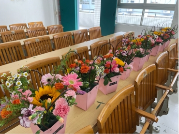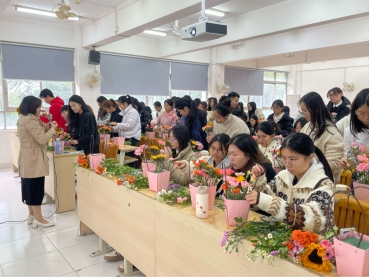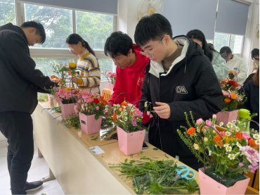 花艺老师讲解完后,开始一步一步教同学们如何插花,同学们迫不及待地开始动手,挑选花朵、修剪花枝,根据花艺老师传授的色彩搭配和造型知识,将不同的花材巧妙地组合在一起。同学们热烈地讨论和赞叹,交流自己的创意和想法,分享对美的感悟,整个教室都弥漫着鲜花的芬芳和青春的活力。
