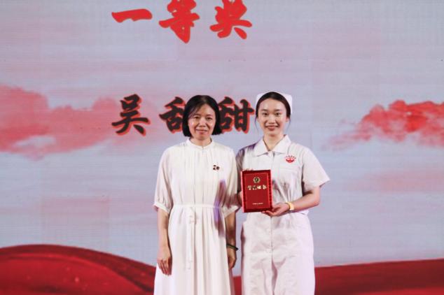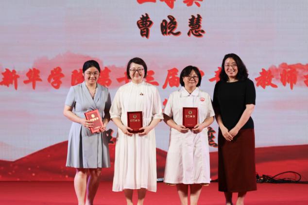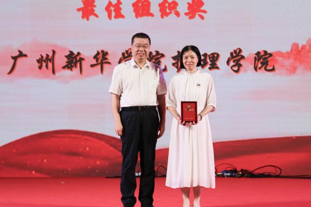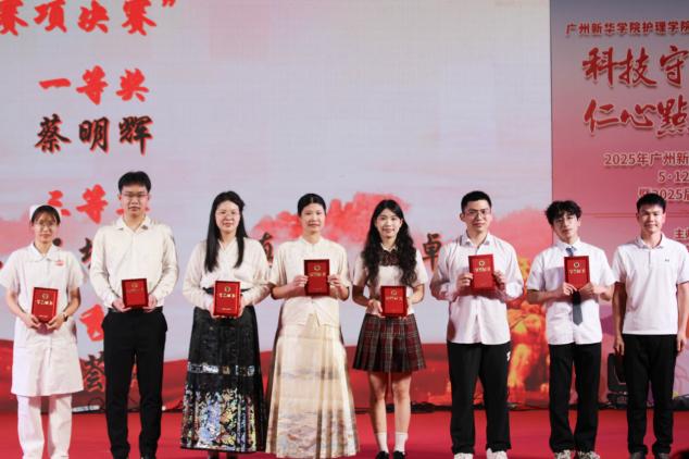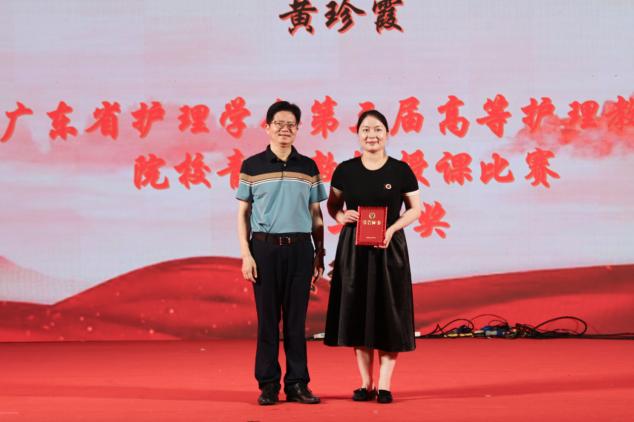 学校党委书记郝登峰为获得2024年第三届高等护理教育院校青年教师授课竞赛(本科组)国家级第三名的奖项,以及广东省护理学会第三届高等教育院青年教师授课比赛省级二等奖的获奖代表颁奖