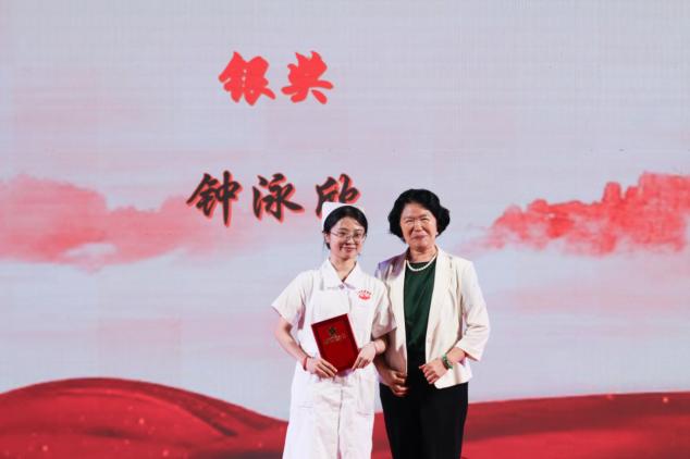 中山大学附属第一医院护理部原副主任陈利芬为获得第二届全国大学生职业规划大赛广东省分赛就业赛道银奖的获奖代表颁奖