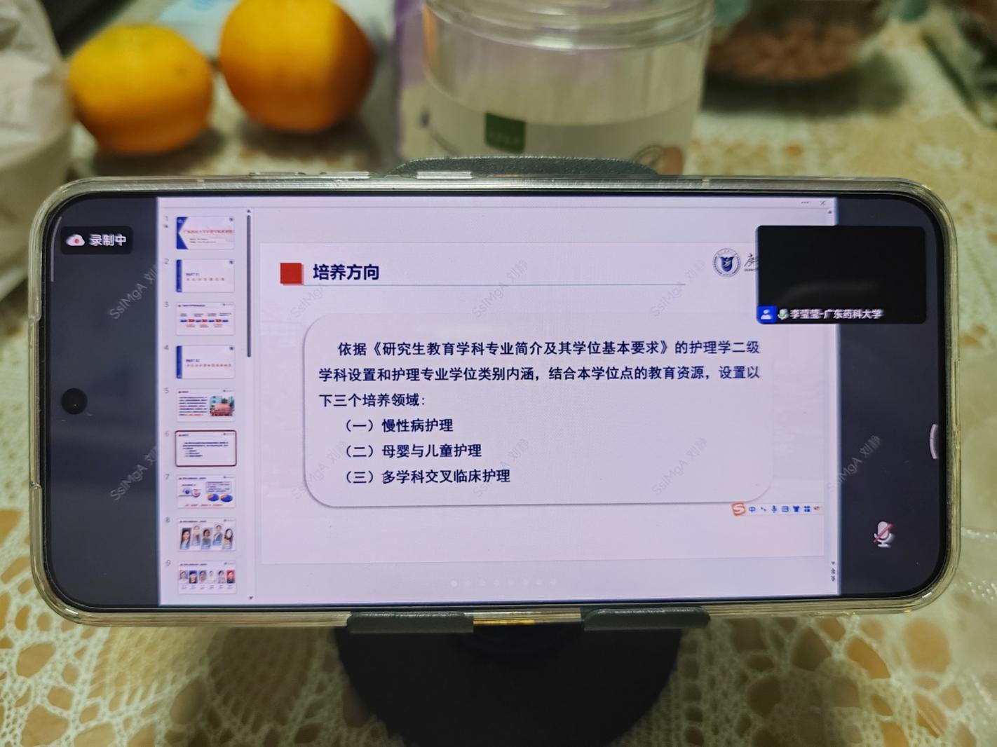 2025年10月22日晚,广东药科大学护理学院在我院举办了线上研究生招生宣讲会,旨在为有意向报考该校研究生的学生们提供详细信息和答疑解惑,一一解开同学们的烦恼。会议由护理学院辅导员刘静主持,广东药科大学护理学院郑晶副院长、李莹莹老师主讲,吸引了众多学生的关注和参与。