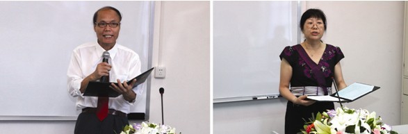 随后在医学系讲学厅举行了客座教授聘任仪式,陈荣冠副书记主持,行政人事部丁艮平部长宣读了学院的聘任文件。赛•海姆教授、迪克•波克先生、关雄熹先生分别从王庭槐院长手中接过聘书,并接受了学生的鲜花。
