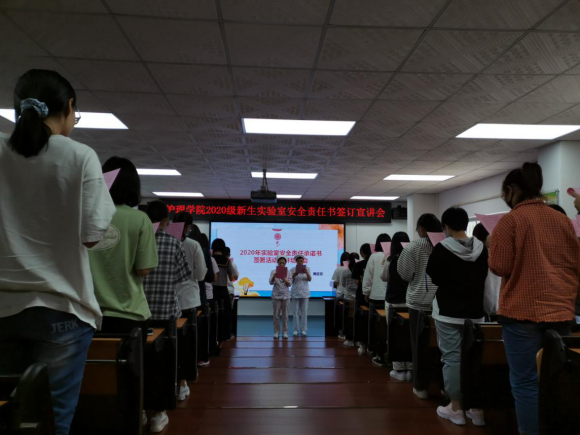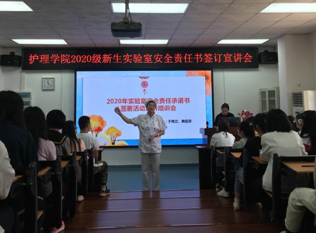 2020年10月14日上午11:00,护理学院2020级217名新生在护理实验实训中心示教室参加了本年度实验室安全责任书签订宣讲会。