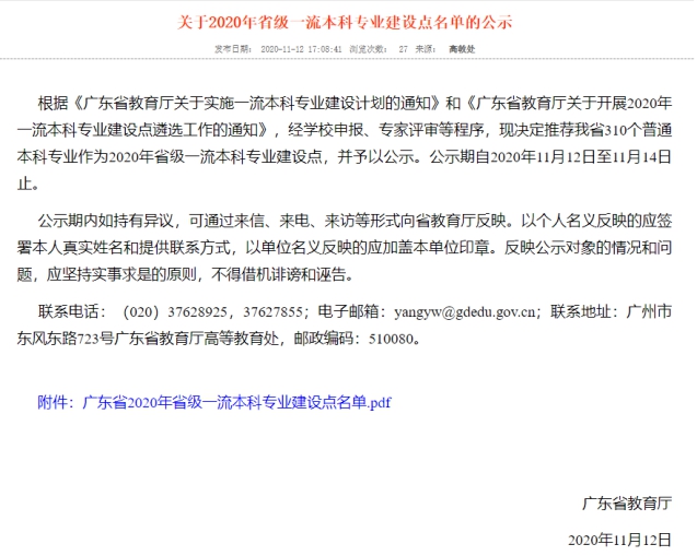 图一:中大新华护理学院护理学专业入选广东省2020年一流本科专业建设点名单截图