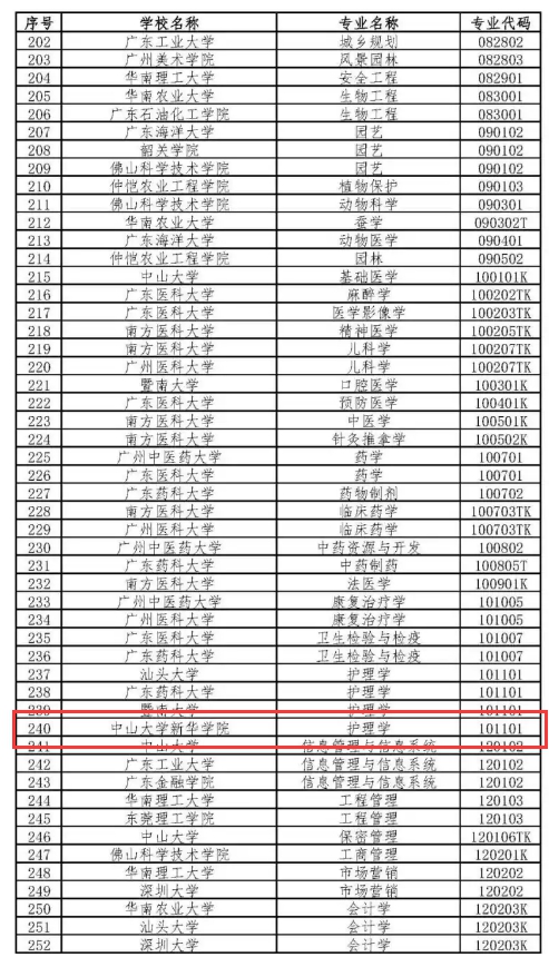 2020年11月12日,广东省教育厅公示了《广东省2020年省级一流本科专业建设点名单》,专业建设点名单显示,在公示的310个普通本科专业中,护理学一流本科专业建设点有4所,分别是汕头大学、广东药科大学、暨南大学和中山大学新华学院,中山大学新华学院作为仅有的一所独立学院入选。