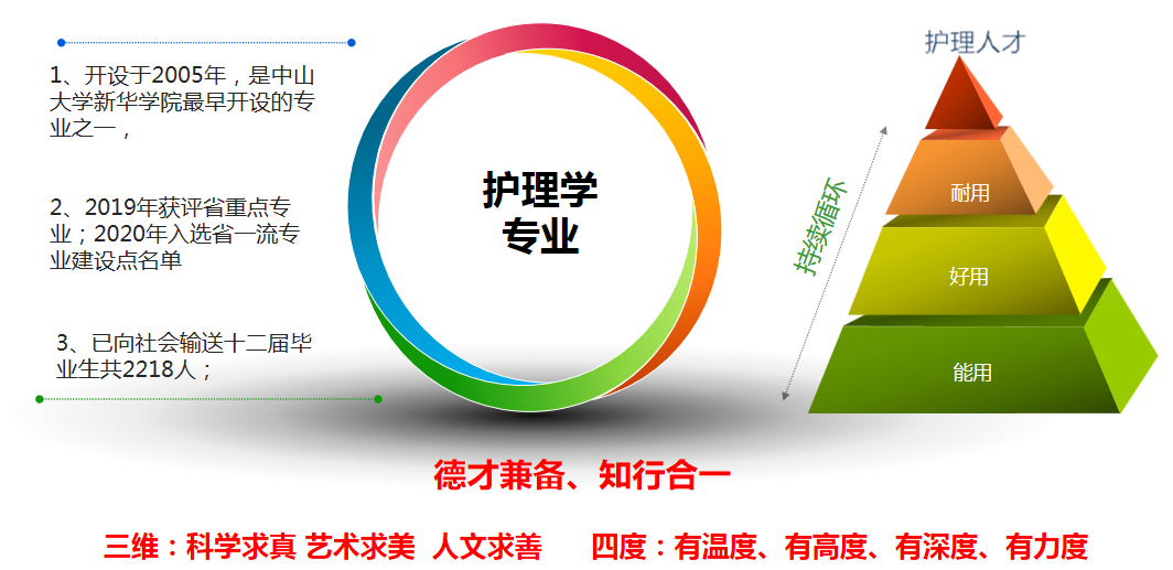 护理学院护理学专业创设于2005年,是中山大学新华学院最早开设的专业之一。护理学专业始终坚持“重人文修养,强职业能力”的人才培养目标,在人才培养方案选择上遵照“国标”,博采众长,在课程设置上注重交叉融合,同时尊重学生个性发展,致力为社会培养具有强技能的“三维四度”的高素质护理人才。所谓三维,是指科学求真,人文求善,艺术求美。四度是指培养的学生能为患者提供有温度、有高度、有深度、有力度的服务。