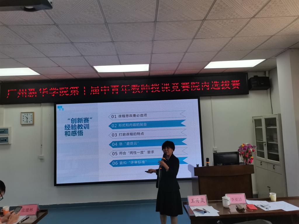 王秀岚院长非常重视本次选拔赛,她对学院青年教师的踊跃报名感到欣慰,希望参赛教师们以赛促教,不断提升教学质量和水平。同时,王院长将自己和团队参加全国首届高校教师教学创新大赛暨广东省高校教师教学创新大赛的感悟进行分享,她指出,课程思政是必选项,将思想政治教育与专业教育有机融合是重中之重,要掌握现代教学的总体目标,课程需体现出知识、能力和素养。对照一流标准,打造具有创新性、高阶性、挑战度的“金课”,扣紧热度整合教学内容,呈现课程教学设计感。学院师生应积极寻求角色转变,教师应从朗读者转化为引领者,从独角戏的主演变成导演;学生从人肉硬盘转变为探索者的必要性,从竞争对手转化为队友。