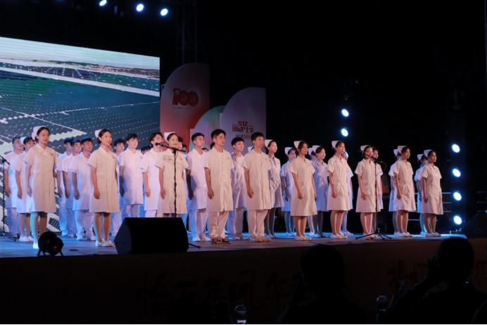 确实,那神圣的党章是一把斧头和一把镰刀。百年华诞、初心不忘。牢记使命、砥砺前行。《前进吧!中国共产党》的大合唱,用歌声歌颂党,贯穿于护理学生心中,让红色的薪火,永不熄灭。