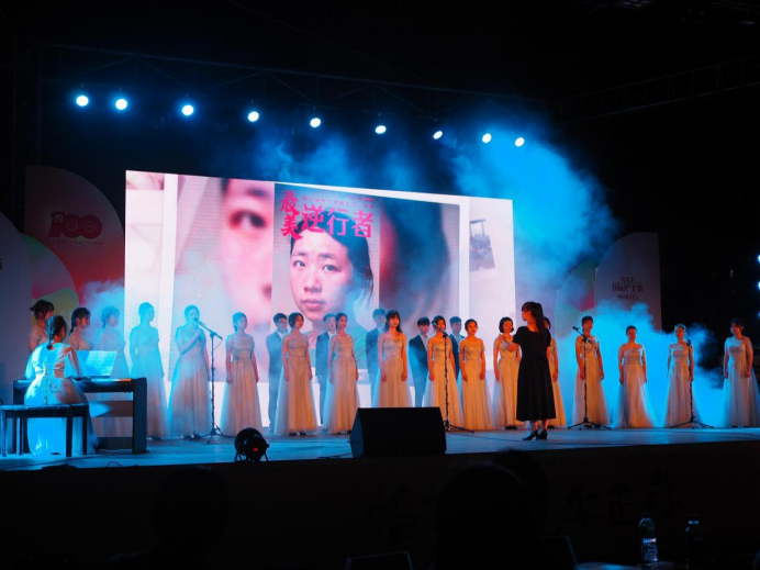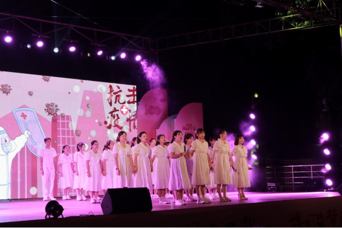授旗与宣誓环节暂告段落,但晚会节目仍未结束。2019级护理B班同学的手语加情景剧《送你一朵小红花》,她们不仅带来了悠扬的乐曲,更将对生活的爱与希望传递给观众,一声声曼妙的歌声,一身身洁白的衣裙,激励我们乐观地面对生活中的挫折与苦难。